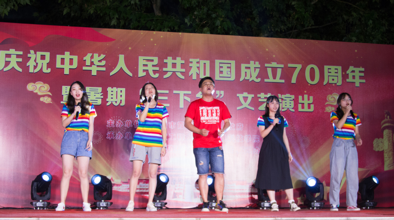 在霞西镇庆祝中华人民共和国成立70周年暨暑期“三下乡”文艺汇演的舞台上,校大学生艺术团的同学们和安徽科技学院的大学生、霞西镇当地的文艺工作者联袂演出。虽然天上下着小雨,但丝毫没能打消演员们的表演热情,乡亲们也一直在雨中坚持观看演出。小品节目诙谐有趣,惟妙惟肖的人物形象将故事主题展现得淋漓尽致;歌声美妙动人,赢得观众掌声不断……。文艺演出在大合唱《我和我的祖国》中落下帷幕,现场演员、观众一起用歌声祝福祖国70华诞。