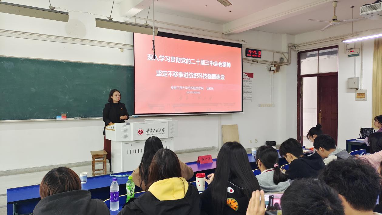 开班典礼结束后,徐珍珍以《深入学习贯彻党的二十届三中全会精神,坚定不移推进纺织科技强国建设》为题讲授党校第一课。她系统梳理了《中共中央关于进一步全面深化改革、推进中国式现代化的决定》的三大板块15部分60条主要内容,结合中国纺织现代化产业体系建设,统筹推进教育科技人才一体化改革,以新质生产力助力纺织科技强国建设。她强调,作为新时代的纺织人,要深学细研党的最新理论,在坚定理想信念中不断增强专业素养和综合能力,为建设“科技、时尚、绿色”的中国纺织现代化产业体系贡献青春力量。