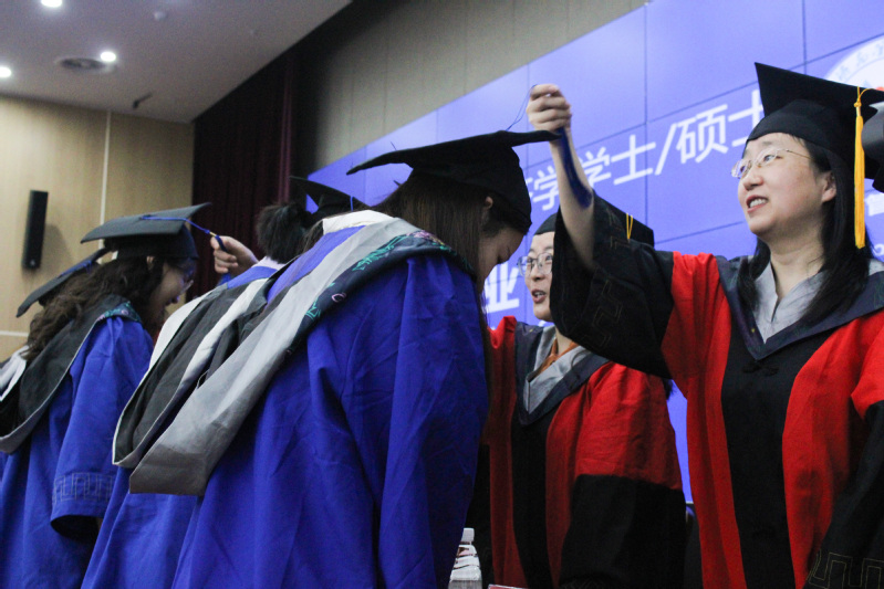 欢乐颂的音乐声中,导师们为毕业生们行拨穗礼。毕业生依次上台,在庄重的仪式上为自己的大学生涯画上完满的句号。