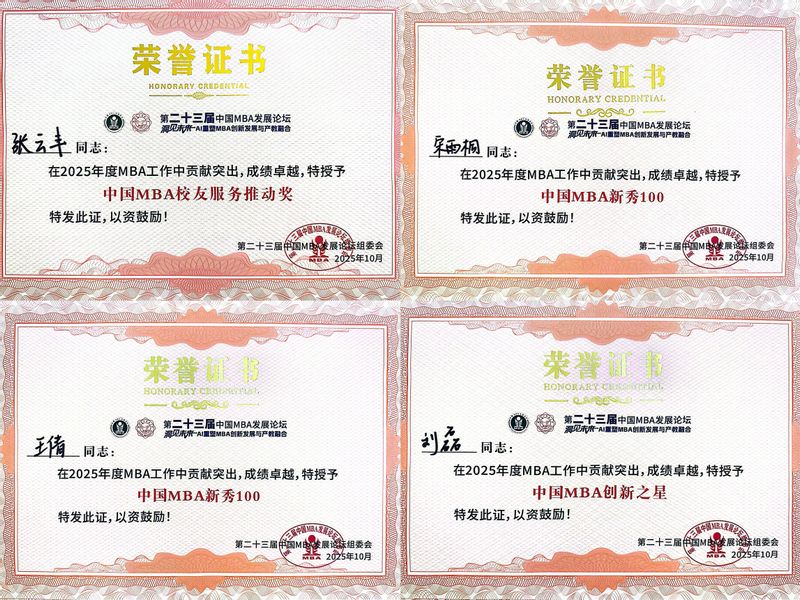 在晚间举行的第二十三届中国MBA发展论坛2025年度颁奖典礼环节,我校MBA教育中心受到中国MBA发展论坛组委会专家们的高度认可并被授予多项荣誉。其中,我校MBA联合会被授予“2025年度中国MBA最佳组织奖”,MBA教育中心主任张云丰荣获“中国MBA校友服务推动奖”,23级学员宋雨桐、24级学员王倩入选“中国MBA新秀100”,25级学员刘磊夺得“中国MBA创新之星”荣誉称号。