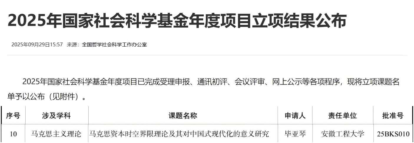 日前,全国哲学社会科学工作办公室公布2025年国家社科基金年度项目立项结果,我院毕亚琴老师申报的课题《马克思资本时空界限理论及其对中国式现代化的意义研究》成功获批国家社科基金一般项目。