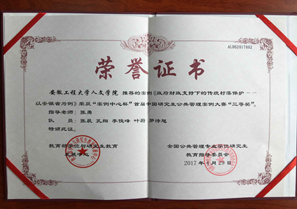 硕士点获批以来,积极组织与参加MPA教指委举办的各项活动,20165篇案例成功入选中国公共管理专业学位教学案例中心,入库数量居安徽省MPA培养院校首位;2017年教育部学位与研究生教育发展中心、全国公共管理专业学位研究生(MPA)教育指导委员会联合主办的“案例中心杯”首届“中国研究生公共管理案例大赛”中心MPA代表队荣获三等奖(安徽省唯一奖项)。