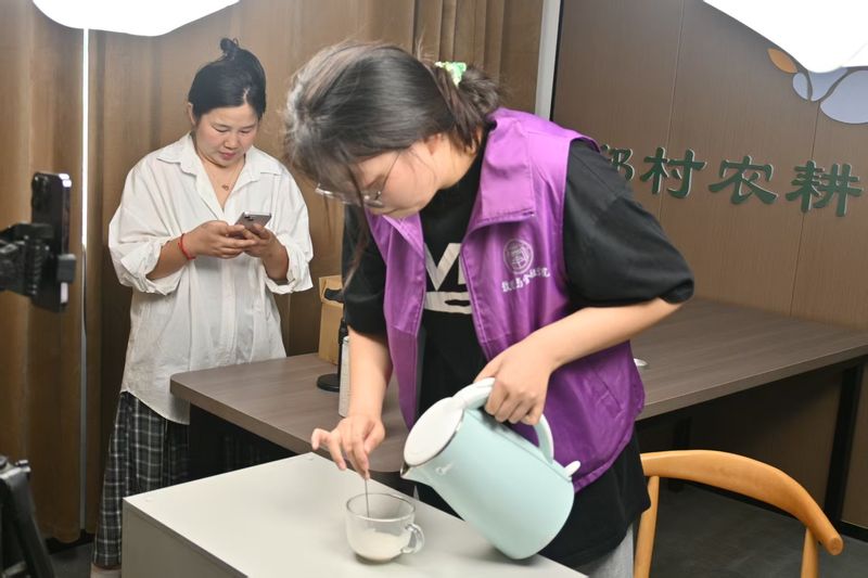 团队成员与当地电商主播殷悦合作开启“直播助农”实践。重点推介邱村镇黄金芽茶叶、葛根粉等特色农产品,在直播间详细介绍黄金芽“三黄透三绿”特点与“高冲低泡”品鉴技巧,展示葛根粉“冷水调开、沸水冲泡”窍门,直播场次获赞2万次。区块链241班张浩伟感慨道:“从梳理产品亮点到镜头前讲解,让我明白直播助农不仅是卖货,更是用青春声音讲好家乡故事。”