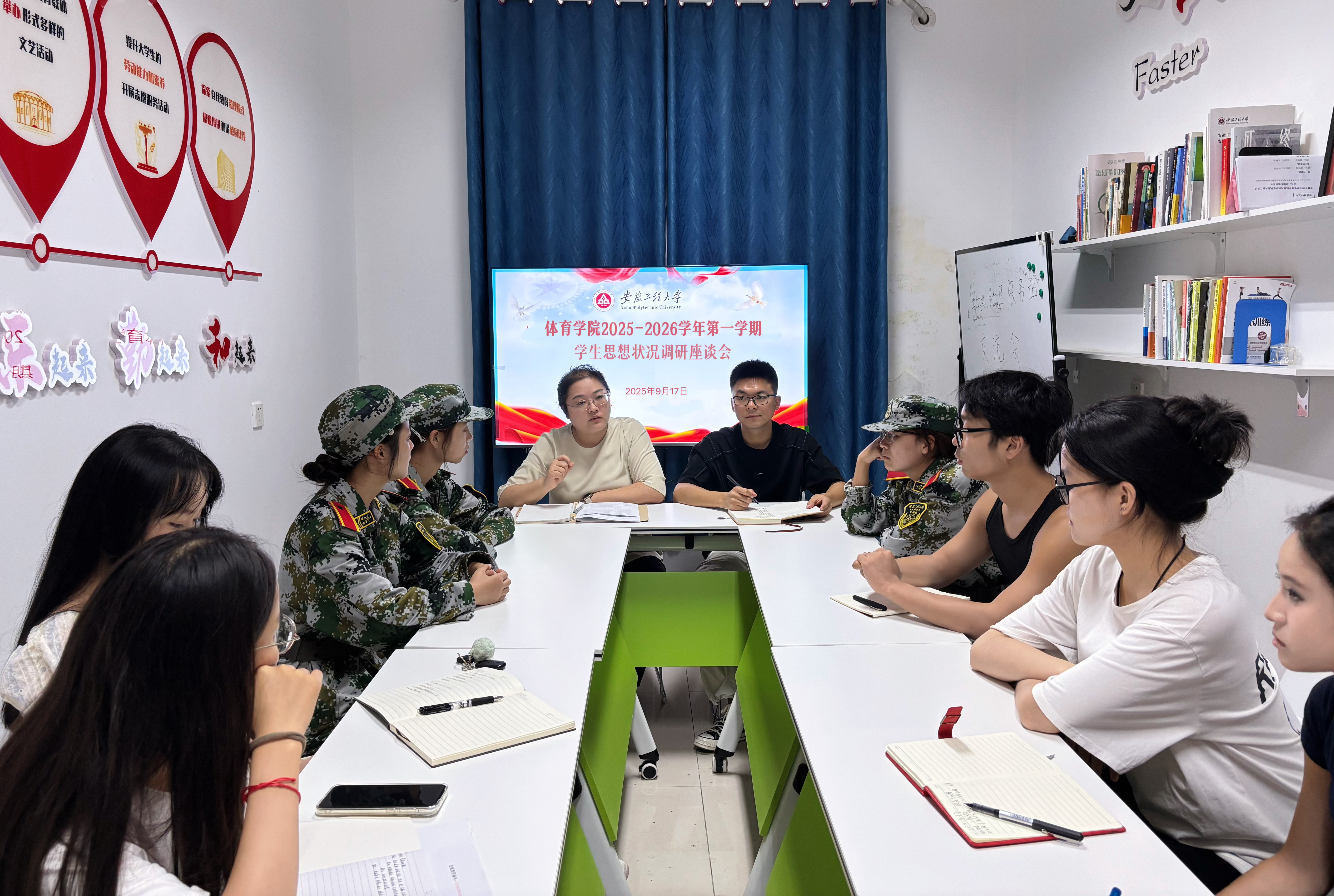 为全面了解学生思想动态、学习生活情况及实际需求,倾听学生心声,回应学生关切,进一步增强思想政治教育的针对性、实效性,9月17日,体育学院在一站式学生社区召开了新学年第一学期学生思想状况调研座谈会。学院党总支副书记马晓琼、团委副书记王康和学生代表参加会议。