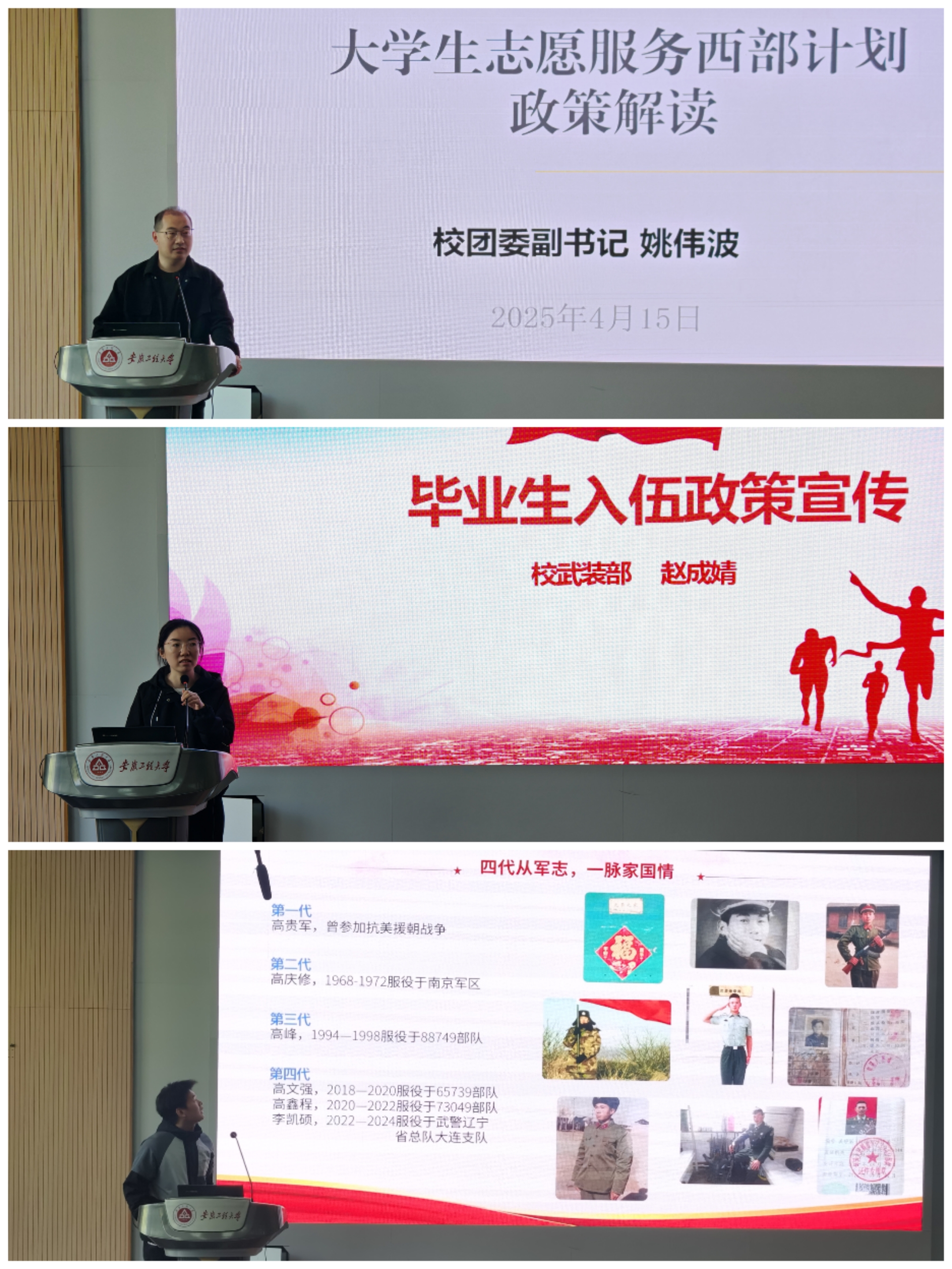 宣讲会上,姚伟波系统解读了西部计划的岗位类型、政策保障及选拔流程,并结合往届志愿者案例,鼓励学生用一到三年不长的时间,做终生难忘的事。武装部赵成婧老师则详细介绍了大学生应征入伍的优待政策,涵盖学业保障、经济补贴、就业支持等方面,特别对毕业生直招军士政策进行重点说明。