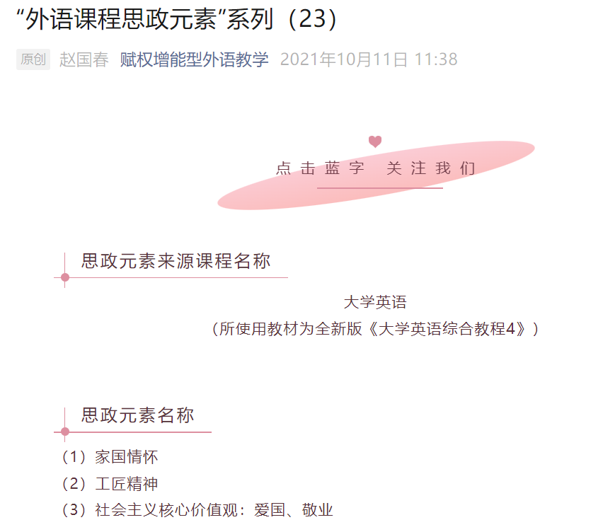 第二,建成了《大学英语1/2/3/4》册课程思政素材库,包括教学设计及教学课件,发到系部群供老师们集体讨论使用,并一直持续动态更新。系部教师也在南开大学公众号“赋权增能公众号”发布推文,介绍思政元素如何与大学英语课程内容有机融合。