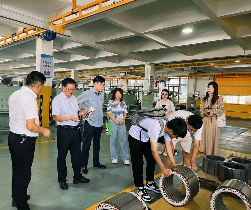 我院教师首先参观了安徽飞翔电器有限公司的生产车间,近距离了解了企业的产品制造过程,对企业的管理和企业文化有了直观感受。飞翔电器是一家集研发、生产、销售和服务为一体的省级技术创新示范企业,主导产品为电机核心部件——电机总成,其产品广泛应用于新能源汽车、风力发电、轨道交通等高效节能电机及发电机等领域。该公司荣获国家专精特新小巨人企业、国家高新技术企业、国家绿色工厂、安徽省皖美品牌示范企业等诸多荣誉。公司创始人王文彬、总经理王锦波、金爱民等接待了我院考察人员,并对公司的初期创业、后期发展和未来规划作了详细介绍。韩利敏对我院的师资情况和人才培养进行了介绍,双方就企业的产品外贸业务和海外市场调研进行了深入讨论和交流。
