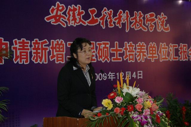 接着,奇瑞汽车股份有限公司副总经理张屏作为企业代表在会上讲话。她强调指出,公司自成立以来,一直与安徽工程科技学院在人才培养、科技开发等方面保持紧密合作,公司的发展离不开安徽工程科技学院的支持与合作。她表示,公司今后的发展需要安徽工程科技学院,需要一大批的应用型创新人才,公司将一如既往地支持安徽工程科技学院研究生的培养,支持安徽工程科技学院申报工程硕士培养单位,希望各位专家和领导给予关心和支持,并预祝安徽工程科技学院申请新增工程硕士培养单位取得圆满成功。