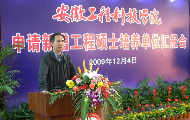省委教育工委书记、省教育厅厅长程艺在会上作了重要讲话。他首先代表省委教育工委、省教育厅对各位专家的到来表示热烈的欢迎,对各位长期以来对安徽省教育事业的关心支持表示衷心的感谢。他在介绍安徽省情和安徽教育概况后指出,安徽省当前要进一步加大高等教育类型结构的调整力度,完善高等教育体系,而大力发展包括工程硕士在内的专业学位研究生教育既是我省经济社会发展的现实需要,又是调整优化高等教育结构的内在要求。安徽工程科技学院近年来发展迅速,成绩有目共睹,特别是在培养应用型创新人才,服务地方经济建设方面做出了重要贡献。他还说,安徽工程科技学院作为工程硕士培养单位将对推动安徽经济建设和社会发展,加快“皖江城市带承接产业转移示范区”建设和“合芜蚌自主创新综合配套改革试验区”建设都有着十分重要的意义。最后他表示对于此次考察评审寄予期望,并恳请各位专家能给予更多的支持,提出更多的宝贵意见和建议。
